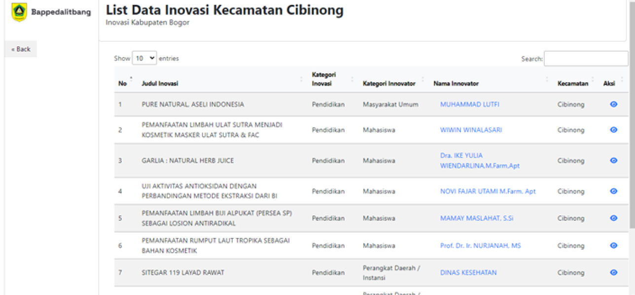 Pada pembuatan aplikasi ini saya bertanggung jawab sebagai Project Manager. Dalam tim saya terdapat 3 bagian dari 5 orang, 3 orang tim programmer, 1 orang tim designer dan 1 orang tim analis dokumentasi. Hasil dari proyek ini adalah sebuah website yang memungkinkan pengguna untuk melihat sebaran seluruh inovasi dan inovator yang tersebar di Kabupaten Bogor. Dengan aplikasi ini, pengguna dapat melihat detail dari masing-masing inovasi dan inovator lewat peta sebaran yang tersedia.