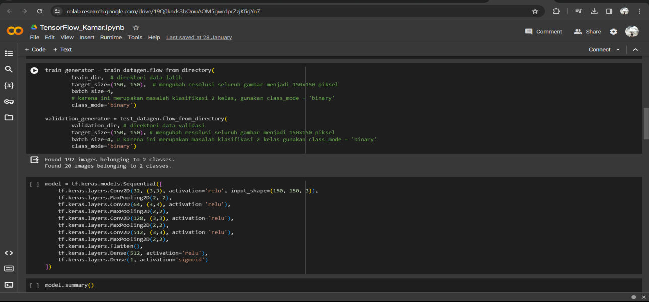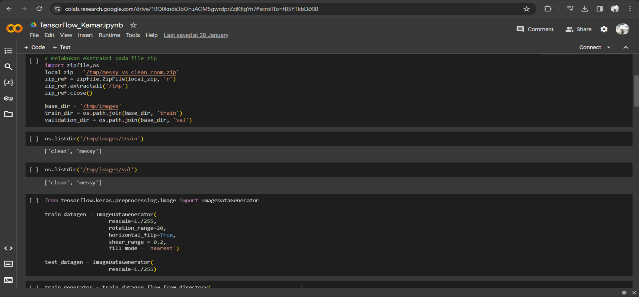 Model ini dibuat menggunakan dataset sebanyak 212 data yang telah mencakup dua kelas yaitu messy and clean. Untuk memprediksi kamar tersebut masuk kedalam kelas yang mana kita harus melatih terlebih dahulu modelnya. Dalam penggunaanya, bisa memasukan gambar berupa kamar yang ingin diprediksi kedalam model tersebut untuk mengetahui apakah kamar tersebut clean atau messsy.